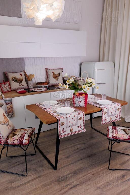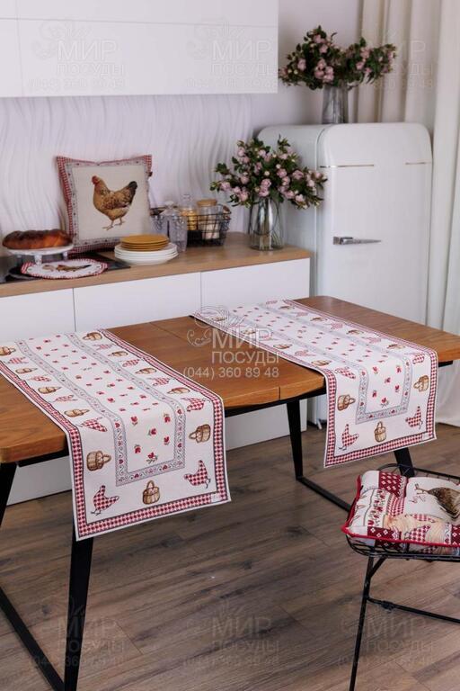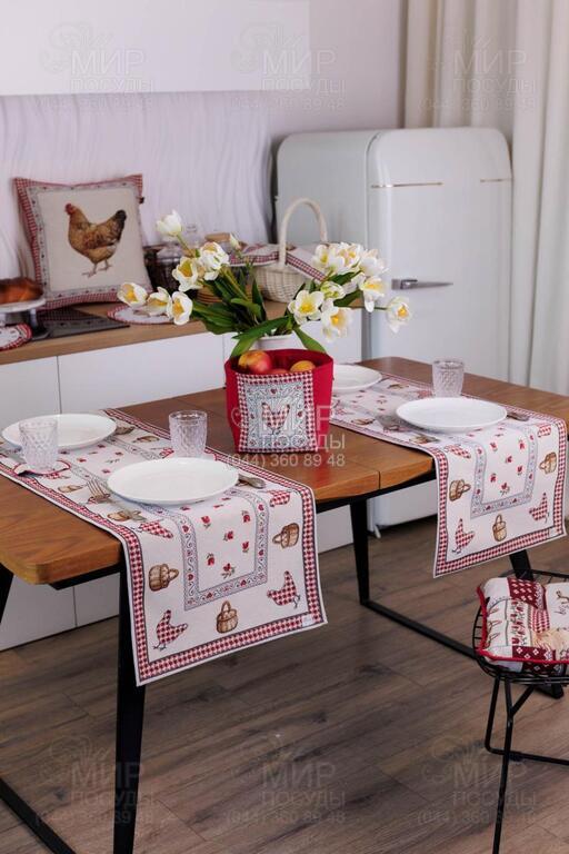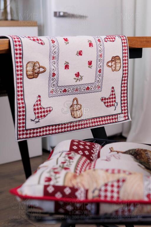 Коллекция гобеленового текстиля Благополучие от украинского бренда Прованс, с колоритным петухом, наполняет кухню атмосферой тепла, ароматом свежей выпечки и ощущением настоящего домашнего уюта. Дизайн вдохновлен фермерской тематикой: выразительные изображения петуха и курочки, мелкий орнамент в клетку, декоративные бордюры и теплая красно-молочная гамма создают атмосферу домашнего тепла и гастрономического уюта. Центральные композиции гармонично дополняются орнаментальными рамками и мелкими тематическими деталями, благодаря чему каждое изделие выглядит завершенным и декоративно насыщенным. Насыщенный красный цвет придает акцент, делая текстиль ярким элементом кухонного интерьера. Гобеленовое переплетение формирует объемный, глубокий рисунок, не наносимый поверх ткани, а сотканный в ее структуре. Благодаря этому изделия отличаются плотностью, долговечностью и износостойкостью, сохраняя форму и цвет даже при активном использовании. В серии представлены скатерти, салфетки, декоративные наволочки, прихватки, дорожки и кухонные аксессуары, легко комбинирующиеся между собой, создавая цельный ансамбль в стиле кантри или прованс.