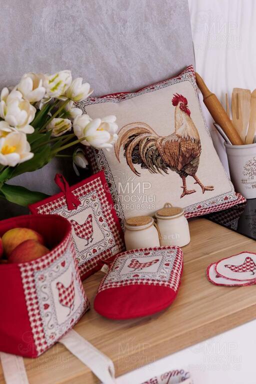 Коллекция гобеленового текстиля Благополучие от украинского бренда Прованс, с колоритным петухом, наполняет кухню атмосферой тепла, ароматом свежей выпечки и ощущением настоящего домашнего уюта. Дизайн вдохновлен фермерской тематикой: выразительные изображения петуха и курочки, мелкий орнамент в клетку, декоративные бордюры и теплая красно-молочная гамма создают атмосферу домашнего тепла и гастрономического уюта. Центральные композиции гармонично дополняются орнаментальными рамками и мелкими тематическими деталями, благодаря чему каждое изделие выглядит завершенным и декоративно насыщенным. Насыщенный красный цвет придает акцент, делая текстиль ярким элементом кухонного интерьера. Гобеленовое переплетение формирует объемный, глубокий рисунок, не наносимый поверх ткани, а сотканный в ее структуре. Благодаря этому изделия отличаются плотностью, долговечностью и износостойкостью, сохраняя форму и цвет даже при активном использовании. В серии представлены скатерти, салфетки, декоративные наволочки, прихватки, дорожки и кухонные аксессуары, легко комбинирующиеся между собой, создавая цельный ансамбль в стиле кантри или прованс.