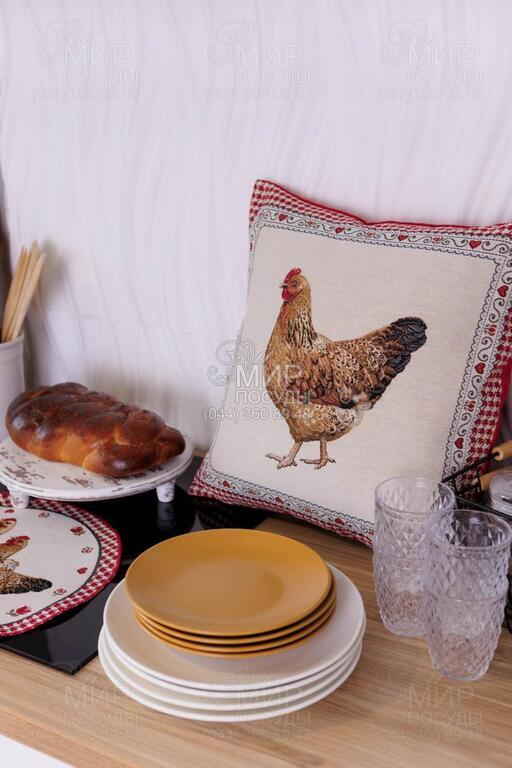 Коллекция гобеленового текстиля Благополучие от украинского бренда Прованс, с колоритным петухом, наполняет кухню атмосферой тепла, ароматом свежей выпечки и ощущением настоящего домашнего уюта. Дизайн вдохновлен фермерской тематикой: выразительные изображения петуха и курочки, мелкий орнамент в клетку, декоративные бордюры и теплая красно-молочная гамма создают атмосферу домашнего тепла и гастрономического уюта. Центральные композиции гармонично дополняются орнаментальными рамками и мелкими тематическими деталями, благодаря чему каждое изделие выглядит завершенным и декоративно насыщенным. Насыщенный красный цвет придает акцент, делая текстиль ярким элементом кухонного интерьера. Гобеленовое переплетение формирует объемный, глубокий рисунок, не наносимый поверх ткани, а сотканный в ее структуре. Благодаря этому изделия отличаются плотностью, долговечностью и износостойкостью, сохраняя форму и цвет даже при активном использовании. В серии представлены скатерти, салфетки, декоративные наволочки, прихватки, дорожки и кухонные аксессуары, легко комбинирующиеся между собой, создавая цельный ансамбль в стиле кантри или прованс.
