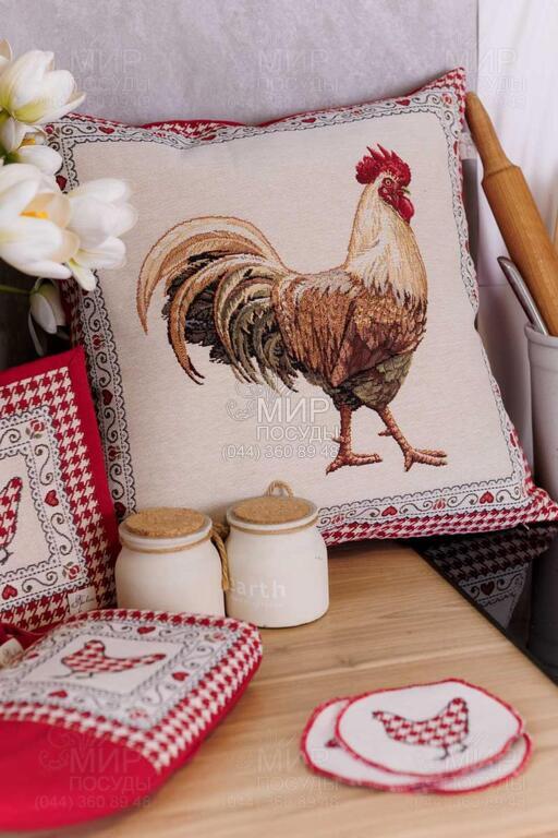 Коллекция гобеленового текстиля Благополучие от украинского бренда Прованс, с колоритным петухом, наполняет кухню атмосферой тепла, ароматом свежей выпечки и ощущением настоящего домашнего уюта. Дизайн вдохновлен фермерской тематикой: выразительные изображения петуха и курочки, мелкий орнамент в клетку, декоративные бордюры и теплая красно-молочная гамма создают атмосферу домашнего тепла и гастрономического уюта. Центральные композиции гармонично дополняются орнаментальными рамками и мелкими тематическими деталями, благодаря чему каждое изделие выглядит завершенным и декоративно насыщенным. Насыщенный красный цвет придает акцент, делая текстиль ярким элементом кухонного интерьера. Гобеленовое переплетение формирует объемный, глубокий рисунок, не наносимый поверх ткани, а сотканный в ее структуре. Благодаря этому изделия отличаются плотностью, долговечностью и износостойкостью, сохраняя форму и цвет даже при активном использовании. В серии представлены скатерти, салфетки, декоративные наволочки, прихватки, дорожки и кухонные аксессуары, легко комбинирующиеся между собой, создавая цельный ансамбль в стиле кантри или прованс.