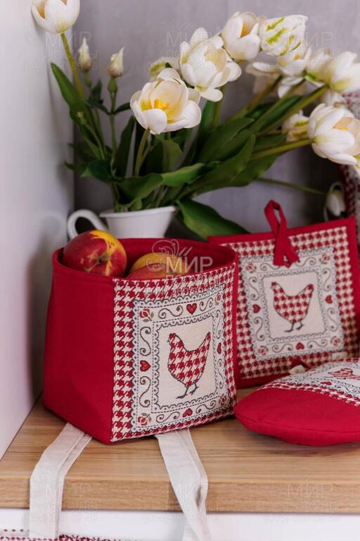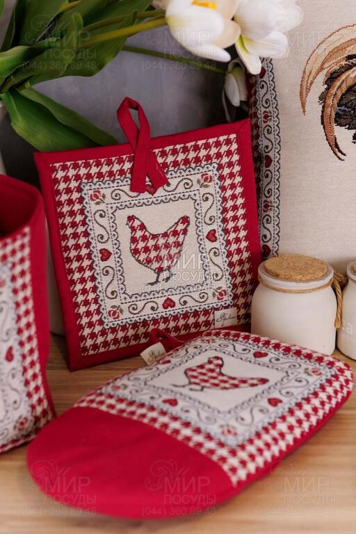 Коллекция гобеленового текстиля Благополучие от украинского бренда Прованс, с колоритным петухом, наполняет кухню атмосферой тепла, ароматом свежей выпечки и ощущением настоящего домашнего уюта. Дизайн вдохновлен фермерской тематикой: выразительные изображения петуха и курочки, мелкий орнамент в клетку, декоративные бордюры и теплая красно-молочная гамма создают атмосферу домашнего тепла и гастрономического уюта. Центральные композиции гармонично дополняются орнаментальными рамками и мелкими тематическими деталями, благодаря чему каждое изделие выглядит завершенным и декоративно насыщенным. Насыщенный красный цвет придает акцент, делая текстиль ярким элементом кухонного интерьера. Гобеленовое переплетение формирует объемный, глубокий рисунок, не наносимый поверх ткани, а сотканный в ее структуре. Благодаря этому изделия отличаются плотностью, долговечностью и износостойкостью, сохраняя форму и цвет даже при активном использовании. В серии представлены скатерти, салфетки, декоративные наволочки, прихватки, дорожки и кухонные аксессуары, легко комбинирующиеся между собой, создавая цельный ансамбль в стиле кантри или прованс.