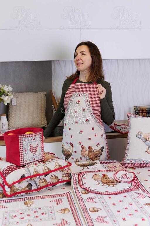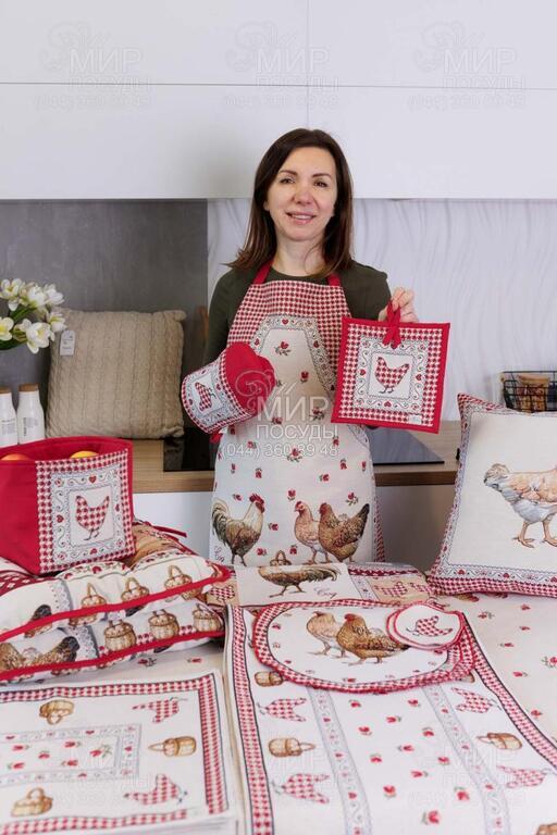 Коллекция гобеленового текстиля Благополучие от украинского бренда Прованс, с колоритным петухом, наполняет кухню атмосферой тепла, ароматом свежей выпечки и ощущением настоящего домашнего уюта. Дизайн вдохновлен фермерской тематикой: выразительные изображения петуха и курочки, мелкий орнамент в клетку, декоративные бордюры и теплая красно-молочная гамма создают атмосферу домашнего тепла и гастрономического уюта. Центральные композиции гармонично дополняются орнаментальными рамками и мелкими тематическими деталями, благодаря чему каждое изделие выглядит завершенным и декоративно насыщенным. Насыщенный красный цвет придает акцент, делая текстиль ярким элементом кухонного интерьера. Гобеленовое переплетение формирует объемный, глубокий рисунок, не наносимый поверх ткани, а сотканный в ее структуре. Благодаря этому изделия отличаются плотностью, долговечностью и износостойкостью, сохраняя форму и цвет даже при активном использовании. В серии представлены скатерти, салфетки, декоративные наволочки, прихватки, дорожки и кухонные аксессуары, легко комбинирующиеся между собой, создавая цельный ансамбль в стиле кантри или прованс.