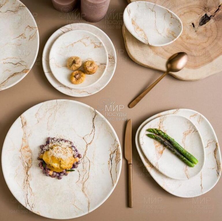 Фарфоровая посуда серии Granix от Bonna – это гармоничное сочетание современной эстетики и природной текстуры. Дизайн коллекции вдохновлен благородной красотой натурального мрамора: светлая поверхность с изящными золотисто-бежевыми прожилками создает эффект камня, который выглядит элегантно, дорого и в то же время очень естественно. Такая посуда придает сервировке изящества и подчеркивает подачу блюд, делая их настоящим центром внимания на столе. Минималистичный, но выразительный дизайн легко сочетается с разными стилями сервировки – от современного до классического.