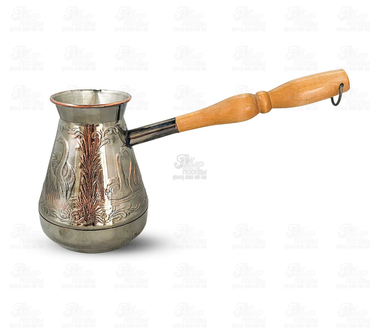 Турка украинского производства изготовлена из меди, идеально сочетает в себе прочность и стиль. Пищевое олово внутри защищает от контакта с медью и оставляет чистый вкус, а наружное покрытие из черного никеля придает современной элегантности. Деревянная ручка, надежно припаянная через медную трубку, делает процесс приготовления кофе удобным и безопасным.