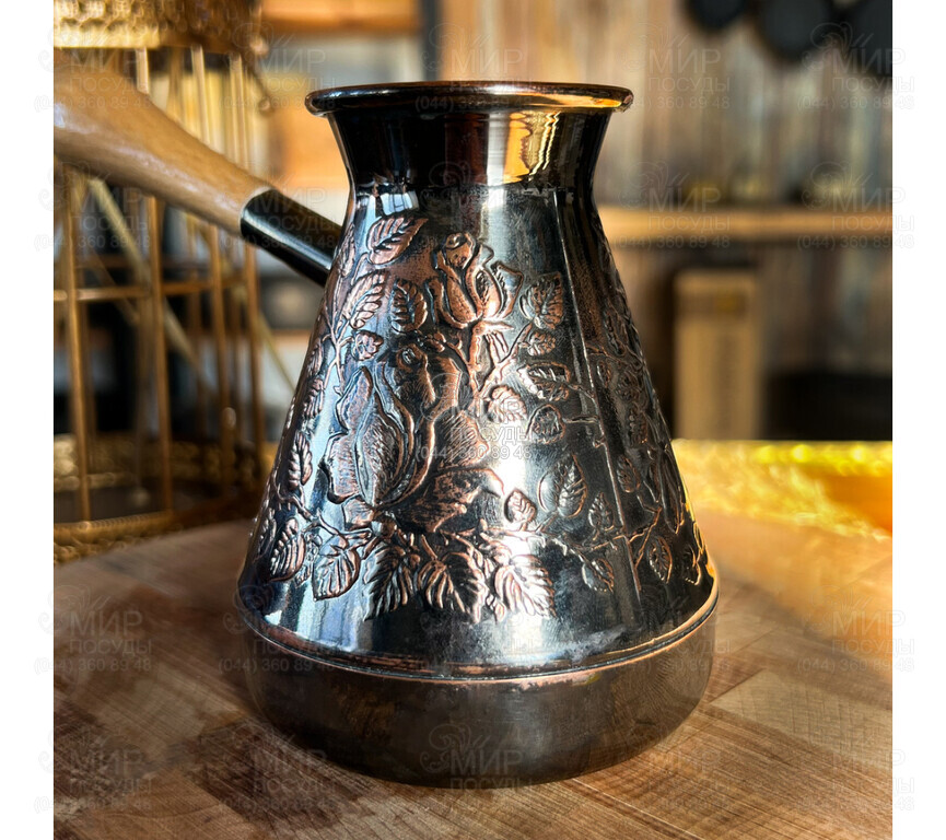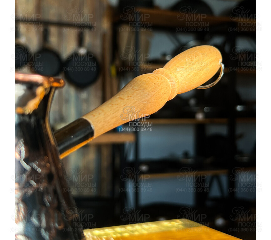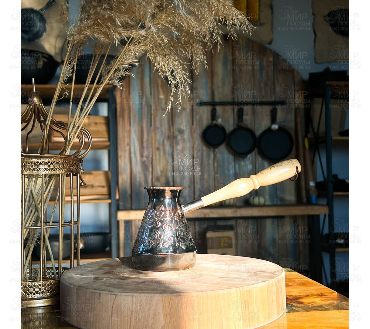 Турка украинского производства изготовлена из меди, идеально сочетает в себе прочность и стиль. Пищевое олово внутри защищает от контакта с медью и оставляет чистый вкус, а наружное покрытие из черного никеля придает современной элегантности. Деревянная ручка, надежно припаянная через медную трубку, делает процесс приготовления кофе удобным и безопасным.