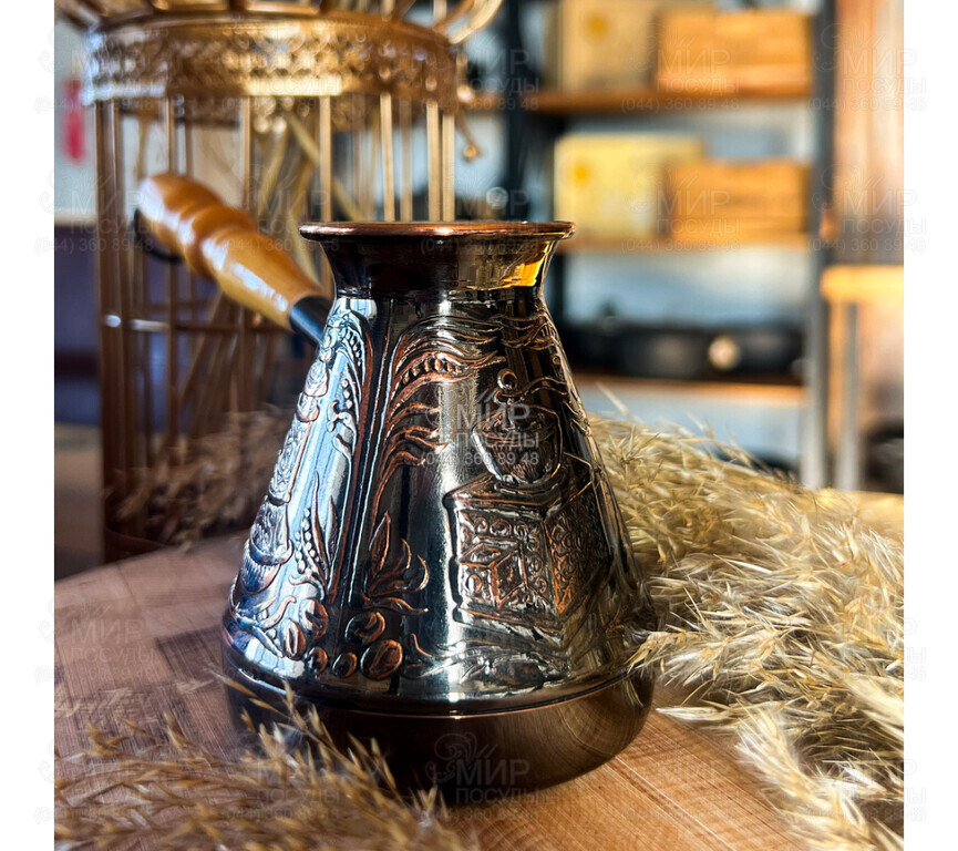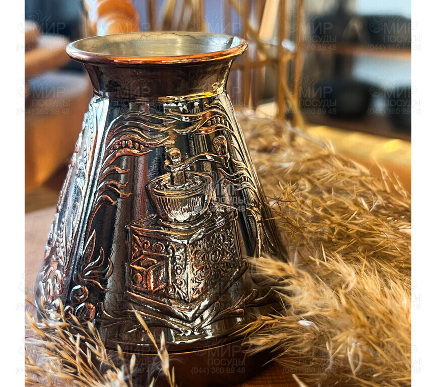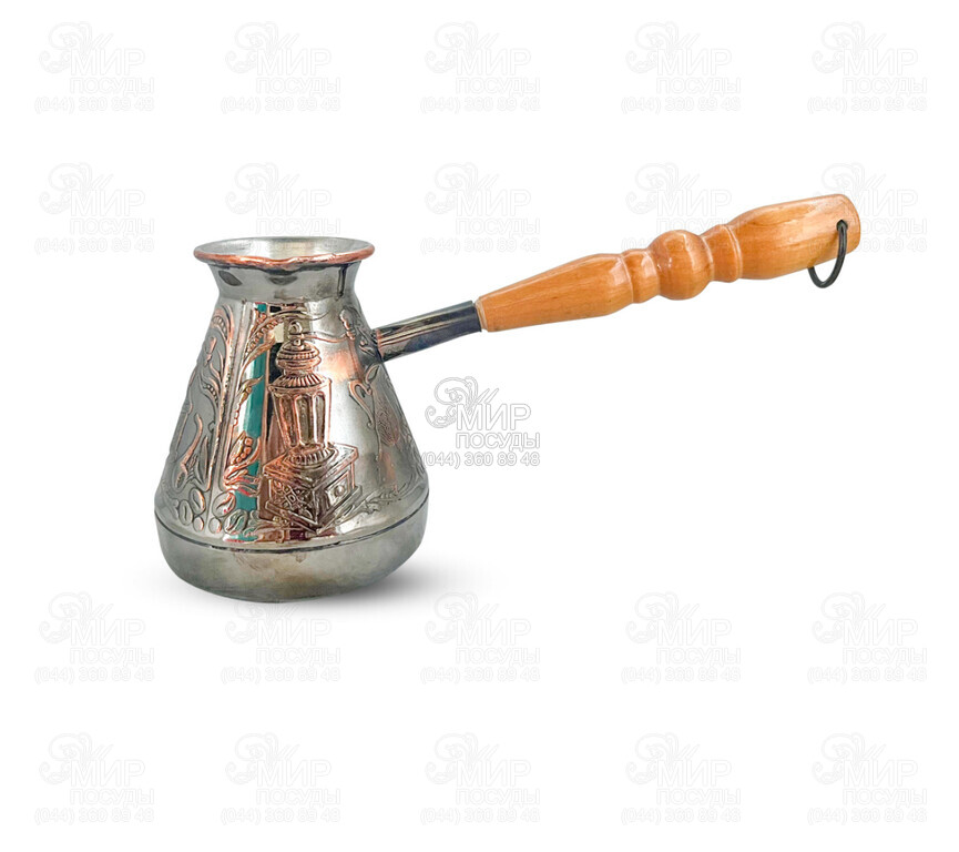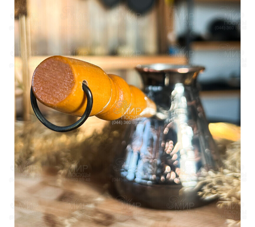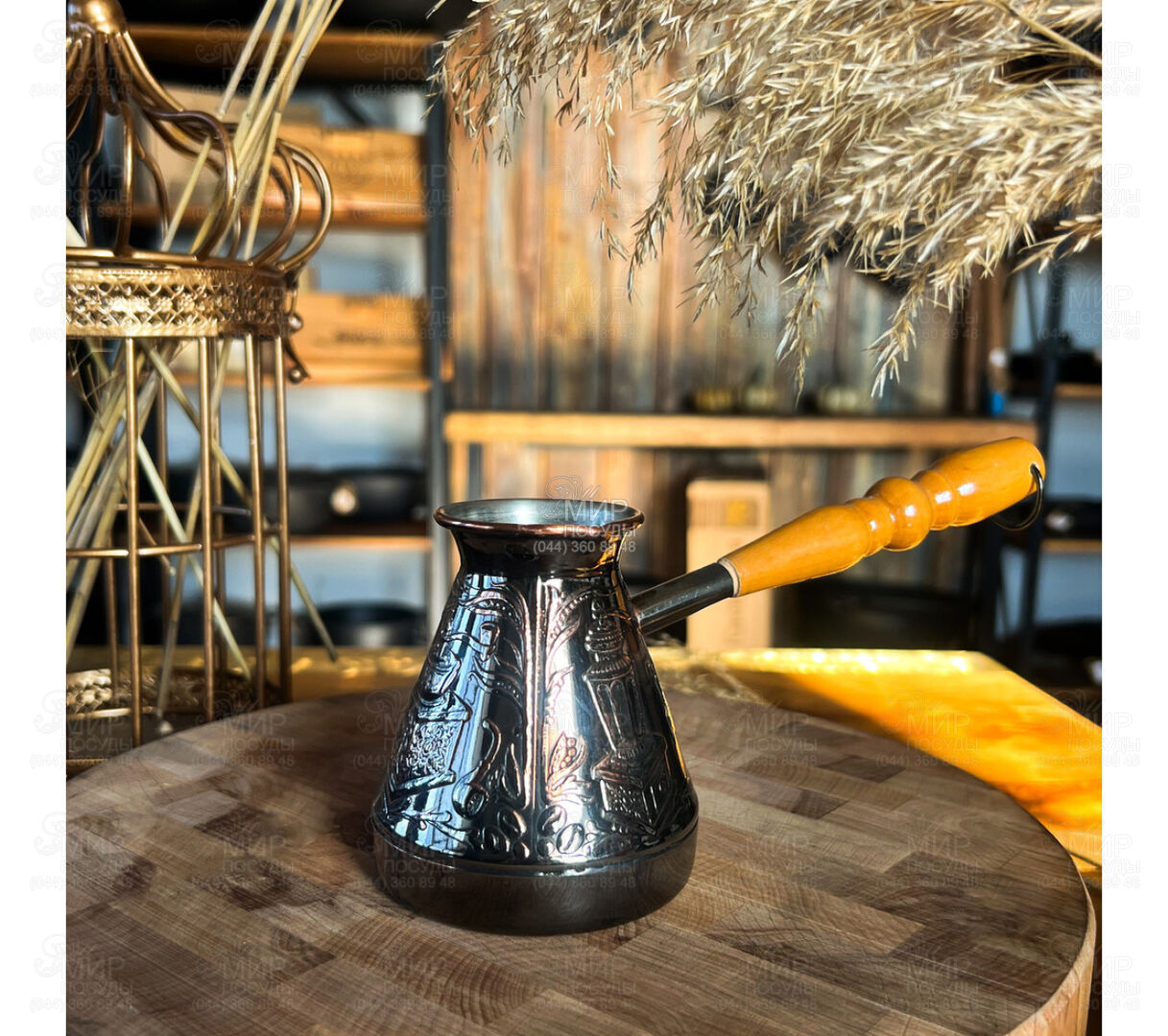 Турка украинского производства изготовлена из меди, идеально сочетает в себе прочность и стиль. Пищевое олово внутри защищает от контакта с медью и оставляет чистый вкус, а наружное покрытие из черного никеля придает современной элегантности. Деревянная ручка, надежно припаянная через медную трубку, делает процесс приготовления кофе удобным и безопасным.