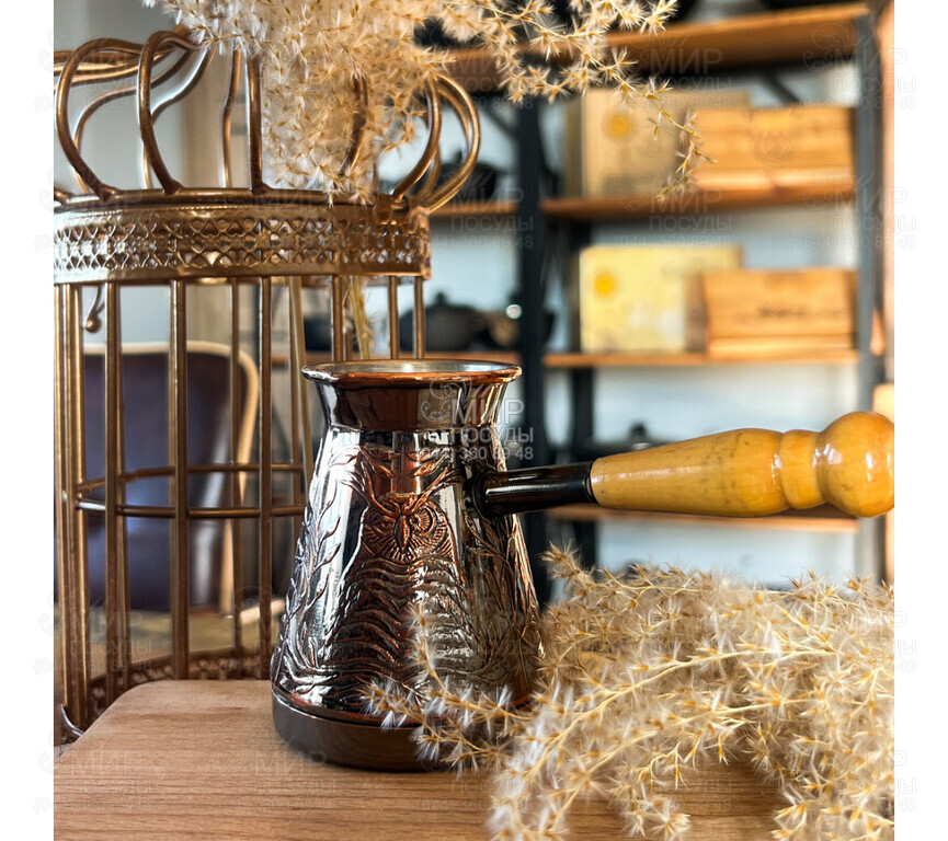Турка украинского производства изготовлена из меди, идеально сочетает в себе прочность и стиль. Пищевое олово внутри защищает от контакта с медью и оставляет чистый вкус, а наружное покрытие из черного никеля придает современной элегантности. Деревянная ручка, надежно припаянная через медную трубку, делает процесс приготовления кофе удобным и безопасным.