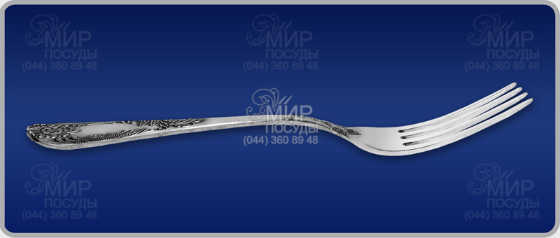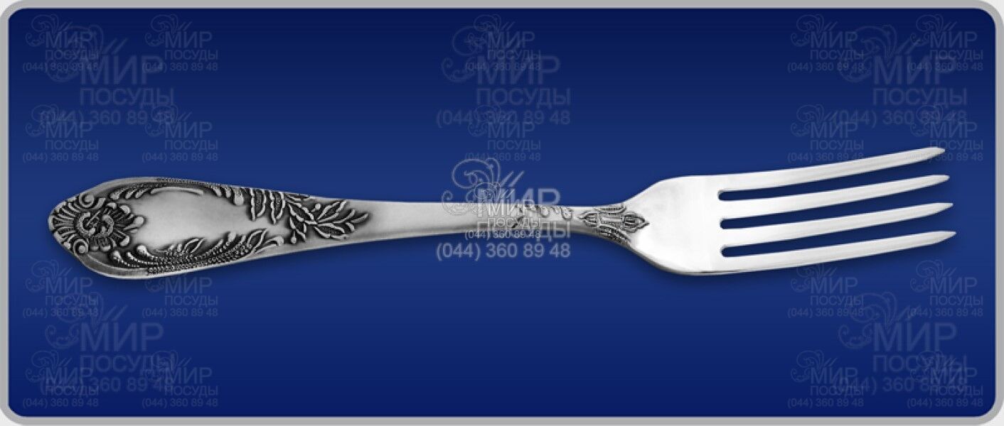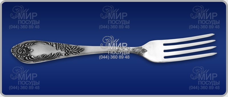Вилка - это удобный и незаменимый предмет посуды за обеденным столом. Прибор изготовлен из мельхиора, и покрыт серебром 999,9° пробы. Эргономичная декорированная ручка хорошо лежит в руке. Элегантный эксклюзивный дизайн покорит в первого взгляда.