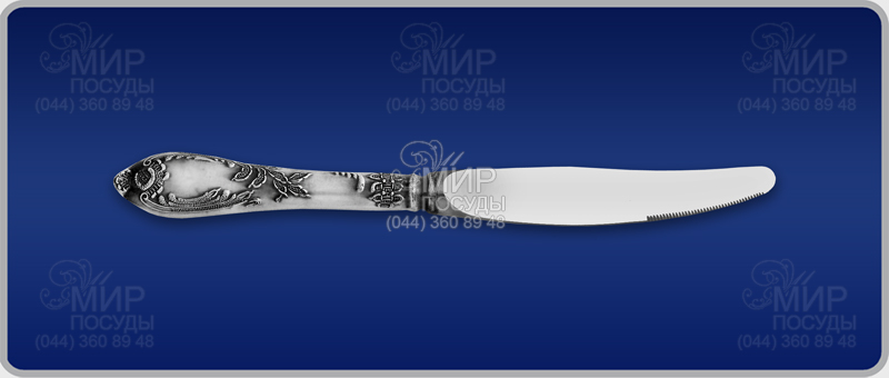 Столовый нож - это удобный и незаменимый предмет посуды за обеденным столом. Прибор изготовлен из мельхиора, и покрыт серебром 999,9° пробы. Эргономичная декорированная ручка хорошо лежит в руке. Элегантный эксклюзивный дизайн покорит в первого взгляда.