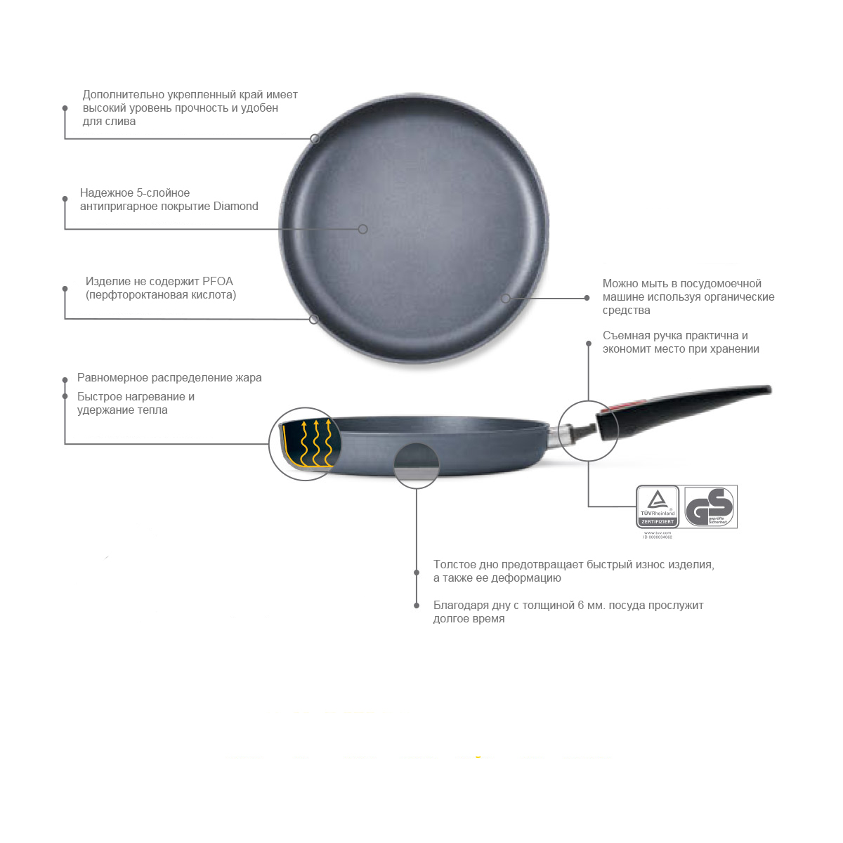 Ковш от немецкого производителя посуды Woll - это продукт высокого качества топ-класса. Посуда изготовлена вручную из литого алюминиевого сплава. Толстое дно оптимально быстро распределяет тепло и удерживает его, не искажаясь при высоких температурах. Края посуды дополнительно укреплены, обеспечивая высокий уровень ударопрочности. Процесс нанесения антипригарного покрытия происходит на собственном производственном предприятии в Германии, использующем самые современные экологически чистые технологии. 5-слойное антипригарное покрытие Diamond чрезвычайно устойчиво к истиранию и порезам. Антипригарное покрытие не содержит перфтороктановую кислоту. Даже при появлении небольших царапин, посуда может быть использована без ущерба антипригарным свойствам и вреда здоровью. Превосходные качества покрытия позволяют готовить еду без масла, обеспечивая здоровое и полезное питание. Эргономичная ручка выполнена из жаропрочного пластика. Съемная ручка отделяется одним переключением кнопки - быстро, легко, удобно при хранении. Можно мыть в посудомоечной машине.