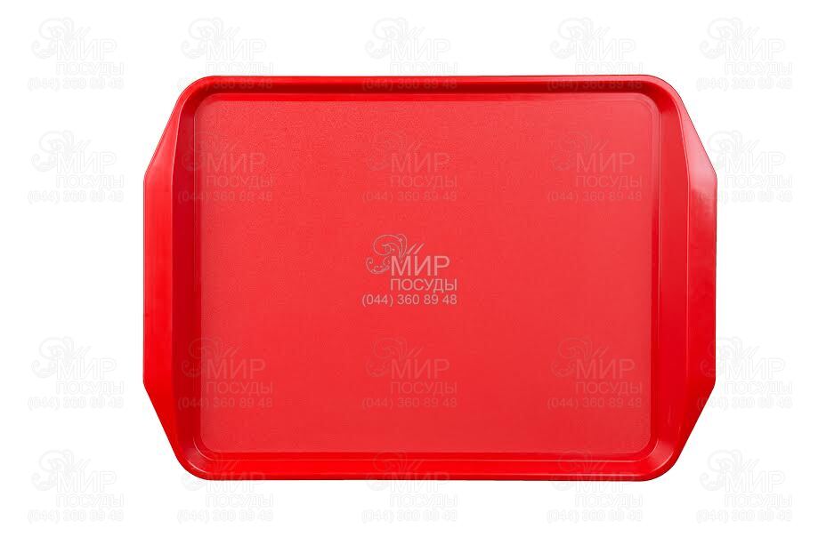 Поднос прямоугольный выполнен из пластика. Он удобный и практичный в использовании, прямоугольной формы, для удобства имеет ручки. Поднос красного цвета.