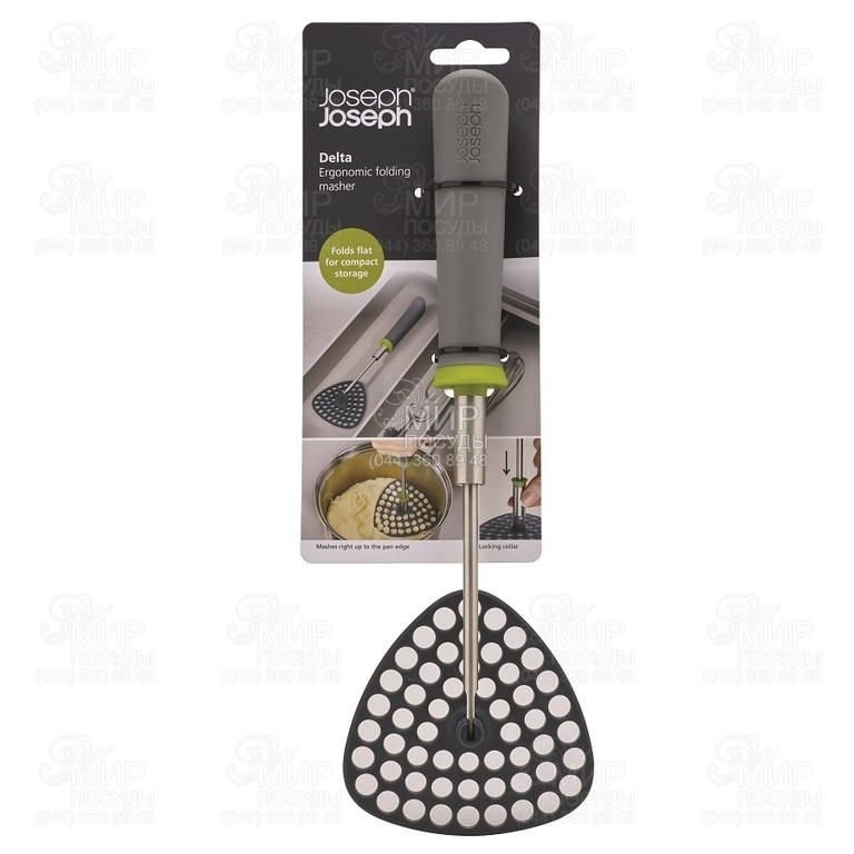 Картофелемялка Delta от английского производителя Joseph Joseph изготовлена из жаростойкого силикона, нейлона и нержавеющей стали. Компактно складывается, поэтому не займёт много места в шкафу. Для закрепления толкушки в вертикальном положении используется валик из нержавеющей стали, а закруглённые края идеально стыкуются со стенками кастрюли. Кроме того, эргономичная ручка выполнена из нескользящего материала. Подходит для посуды с антипригарным покрытием.
