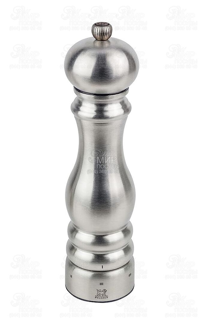 Мельница для перца Paris Chef от французского производителя Peugeot изготовлена из нержавеющей стали. Продуманный дизайн изделия удачно сочетает практичность, надежность и эстетичность. Благодаря хорошей эргономике ее удобно удерживать в руках, а механическая система управления не требует особых навыков и умений. Для изменения интенсивности измельчения на корпусе предусмотрена небольшая гайка, повернув которую по часовой стрелке, вы установите режим мелкого помола, а против часовой - грубого. Особенностью модели является технология защитного напыления, которая длительное время сохраняет остроту лезвий.