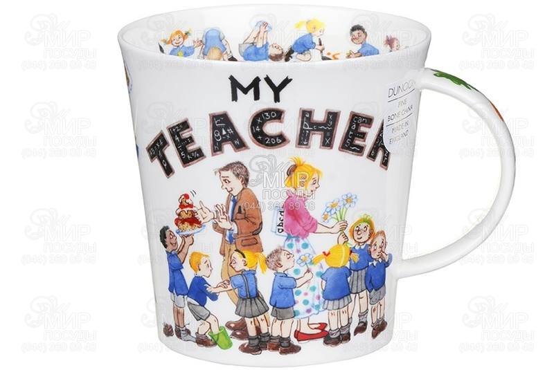 Кружка My teacher от английского производителя Dunoon изготовлена из костного фарфора. Это тонкий, легкий и прочный материал, теплый и гладкий на ощупь, полупрозрачный на свете, обладающий особым глянцево-шелковистым блеском. Емкость обладает довольно удобной формой с эргономичной ручкой. Декорирована забавным рисунком в виде ярких фрагментов школьных уроков с учителями и учениками. Изделие придется по душе каждому человеку с безупречным вкусом.