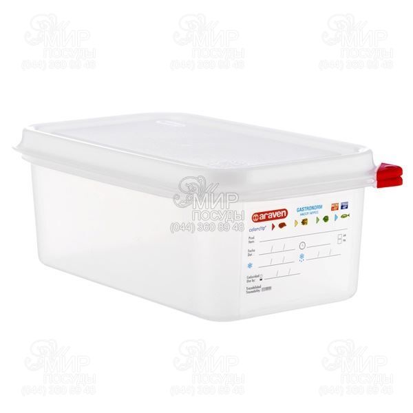 Контейнер от испанского производителя Araven изготовлен из пищевого полипропилена. Обладает иновационной системой закрытия крышки. Используется в магазинах, супермаркетах, кондитерских, пиццериях, гриль- и суши-барах, гостинично-ресторанных комплексах и в других заведениях общественного питания. Герметичный контейнер GN 1/9 Araven не деформируется от резких термических перепадов, легко моется и легкий в эксплуатации. Может использоваться в большом диапазоне температур от -45 до +95 °C. Имеет новый дизайн крышки, благодаря двойной воздухонепроницаемой кромке на крышке, улучшается воздухонепроницаемость контейнера, что позволяет качественнее и дольше сохранять пищу. Также на крышке существует канал, который позволяет вытеснять часть воздуха внутри контейнера, уменьшая окисление пищи и продлевая срок ее службы до 25%. Крышка гастроконтейнера имеет специальную вкладку для более легкого открытия контейнера. Пищевая емкость также включает в себя цветные клипсы, с помощью которых можно управлять пищевыми продуктами и на большой вплавленной этикетке гастроконтейнера ставить метки для отслеживания. Это позволяет специалисту на профессиональной кухне идентифицировать содержимое и сохранить информацию, связанную с его происхождением. Контейнер для пищевых продуктов Araven соответствует всем требованиям в отношении норм санитарии и безопасности HACCP и CE.