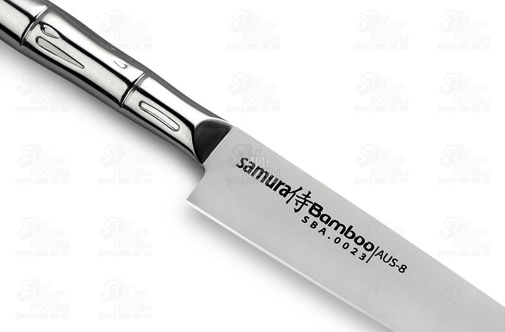 Легкий и многофункциональный универсальный нож - самый популярный инструмент на домашней и профессиональной кухне, используется для резки небольших овощей и фруктов, сыра. Японская нержавеющая cталь AUS-8, из которой изготовлен нож, обладает хорошей коррозионной устойчивостью, отличной стойкостью режущей кромки, легко полируется и шлифуется. Уникальная металлическая рукоятка в форме бамбука препятствует скольжению и абсолютно гигиенична. Ножи Samura "Bamboo" можно использовать не только дома, но и в профессиональном секторе HoReCa, так как ножи соответствуют всем нормам СЭС для кухонных ножей, используемых на кухнях кафе и ресторанов. Эти ножи можно мыть в посудомоечной машине. Полноценный стальной клинок от лезвия до хвостовика, тонкий обух и легкость ножа, японская эргономичная форма - все это существенно облегчает работу ножом и доставляет максимум удовольствия.