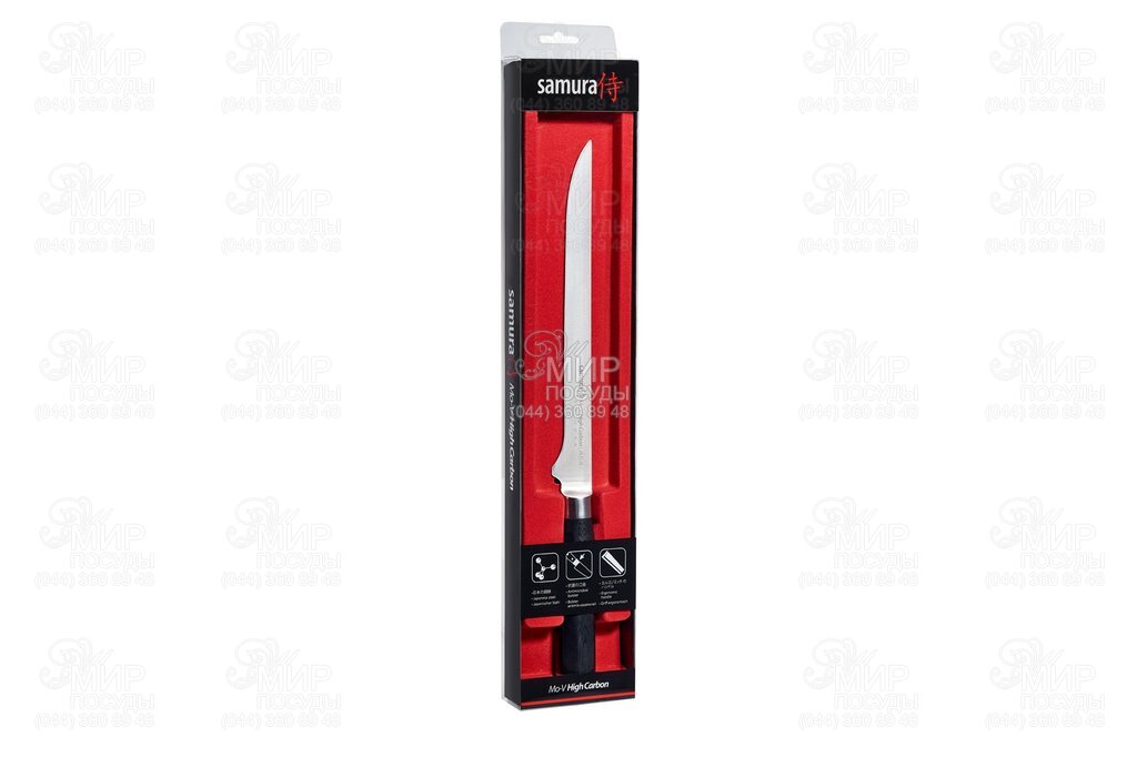 Удобный филейный нож с тонким и гибким лезвием необходим при разделки курицы, рыбы, для отделения филе от костей.Японская нержавеющая cталь AUS-8, из которой изготовлен нож, обладает хорошей коррозионной устойчивостью, отличной стойкостью режущей кромки, легко полируется и шлифуется. Рукоять ножа, выполненная из влаго- и термостойкого материала G-10, удобно лежит в руке, не скользит и устойчива к агрессивным средам. Samura "Mo-V" - это не дорогие и практичные ножи современного дизайна, которые станут истинным украшением на любой кухне.
