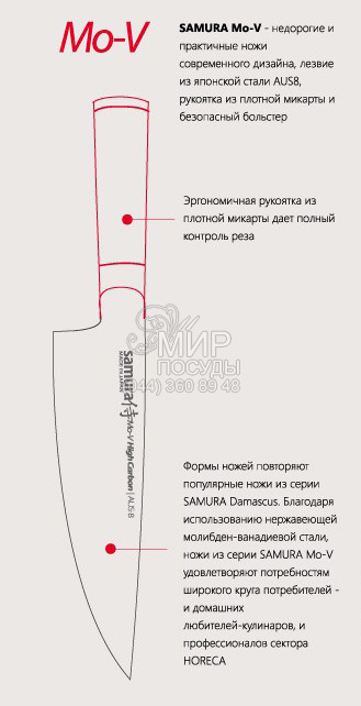 Незаменимая "поварская тройка" в картонной упаковке. Японская нержавеющая cталь AUS-8, из которой изготовлен нож, обладает хорошей коррозионной устойчивостью, отличной стойкостью режущей кромки, легко полируется и шлифуется. Рукоять ножа, выполненная из влаго- и термостойкого материала G-10, удобно лежит в руке, не скользит и устойчива к агрессивным средам. Samura "Mo-V" - это не дорогие и практичные ножи современного дизайна, которые станут истинным украшением на любой кухне.