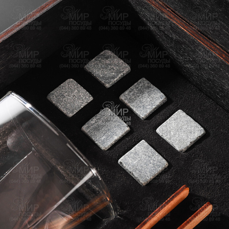 1. Качественная деревянная подарочная упаковка 20 на 20 см на 11 см в темном дереве. Внутренняя часть - это мягкий бархатный ложемент (камни и бокалы всегда будут целые и красиво, престижно хранится) в котором лежат оригинальные камни для виски 6 шт, мешочек для камней из экокожи, стакан, щипцы и подставка под бокалы.