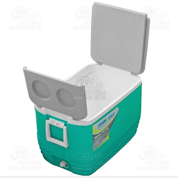 Изотермичный контейнер от индийского производителя Pinnacle изготовлен и ударопрочного пластика. Внутренний слой состоит из экологически безопасного пластика, а термоизоляцией служит специальный пенопласт. Наличие фиксатора закрытого положения в крышке предупреждает выпадение содержимого контейнера. Присутствует клапан быстрого доступа. Поддерживает температуру при помощи аккумуляторов Ice Akku, Soft Ice, Thermos. Обладает встроенным сливом и подстаканниками на внешней части крышки. Небольшие, но крепкие ручки с обеих сторон позволяют без затруднений переносить контейнер.