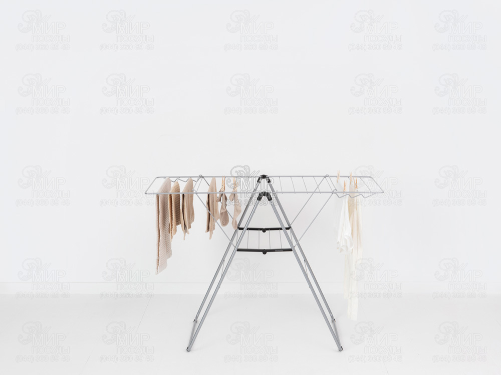 Сушилка напольная для 25 метров навески. Экономим время и электроэнергию, отказываясь от сушильной машины в пользу естественной сушки белья. Одновременно экономим место, выбирая эту компактную напольную сушилку. Целых 25 метров навески всего на нескольких квадратных метрах плюс перекладина сверху, на которой можно дополнительно разместить большое количество плечиков. Закончив свою работу, легко складывается до плоского состояния и компактно хранится.