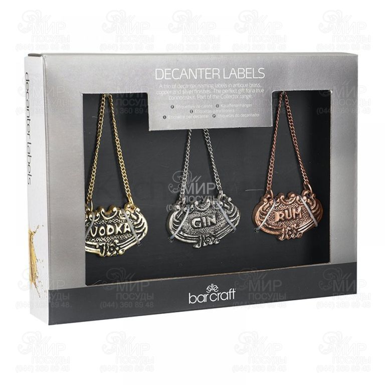 Набор навесок состоит из трех алюминиевых бирок, выполненных в винтажном стиле. На каждой бирке нанесено название напитка, для которого они предназначены. Отлично подходят для маркировки содержимого домашнего бара.
