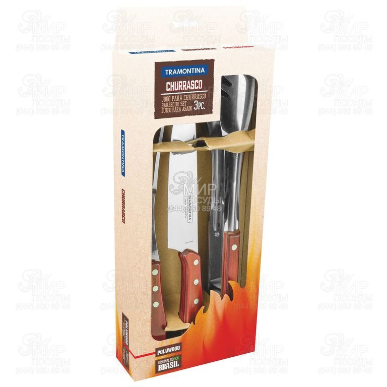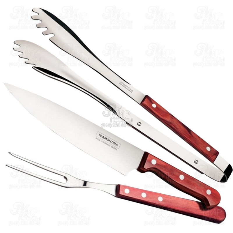Набор для барбекю серии Polywood от бразильской компании по производству посуды Tramontina надежен и практичен. Лезвие ножа и рабочие части вилки и щипцов изготовлены из мартенситной нержавеющей стали AISI 420, для которой характерна высокая износостойкость. Благодаря термообработке прочность стали увеличивается. Отполированная до зеркального блеска, сталь не темнеет и не мутнеет со временем. Ручки выполнены из натурального дерева, тщательно шлифованного и дополнительно обработанного, что делает их водостойкими. Алюминиевые заклепки надежно закрепляют ручки.