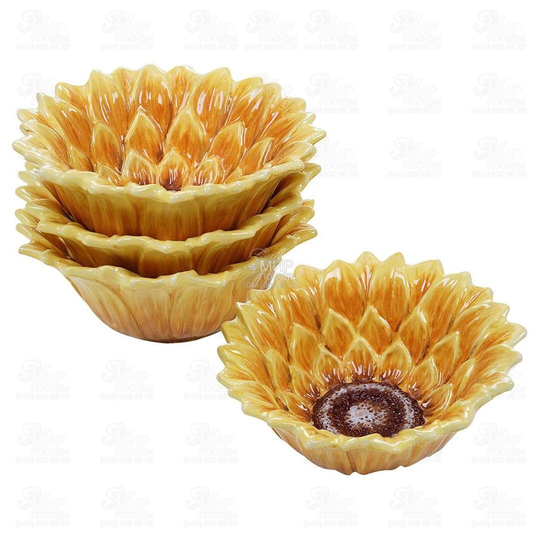 Красивые глубокие пиалы в виде ярких подсолнухов станут эффектным штрихом сервировки с посудой «Солнечный сад», дизайн которой разработала американская художница Сьюзан Уингет. Керамические изделия с множеством ярких лепестков и рельефной коричневой серединкой полностью расписаны вручную. Пиалы можно поставить на стол в качестве декоративных украшений. Также в них можно подавать различные десерты: мороженое, ягоды или конфеты. Набор пиал из лимитированной коллекции станет роскошным подарком, ценность которого возрастет с годами.