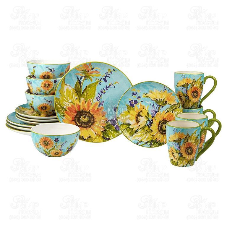 Овальное керамическое блюдо из коллекции «Солнечный сад» напоминает летнюю акварель с фрагментом залитого светом поля подсолнухов, которые гармонично дополняют нежные фиолетовые цветы. На небесно-голубом фоне едва различимы полупрозрачные тени от обильной листвы, которая по тону совпадает с тонкой каймой по периметру. Автором нарядного рисунка стала американская художница Сьюзан Уингет, которую привлекли к созданию всего дизайна коллекции.