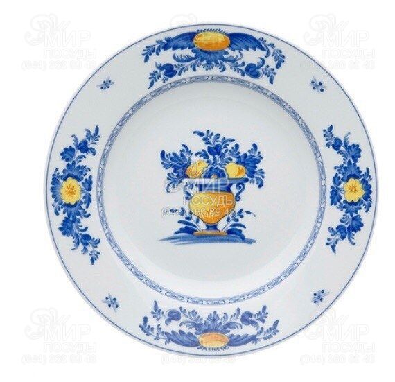 Серия Viana изготовлена из высококачественного фарфора. Вычурные цветочные композиции в синем цвете, расположенные по краю, освежаются ярко-желтым цветком в центре каждого букета. Ваза-амфора, помещенная в середину, выполненная в тех же цветах, вносит элемент античности в дизайн изображения. Внутри по ободу украшена синим орнаментом. Эта уникальная посуда вдохновленная декораторами венских мотивов обильно украшающих порт Виана-ду-Каштелу в 18 веке.