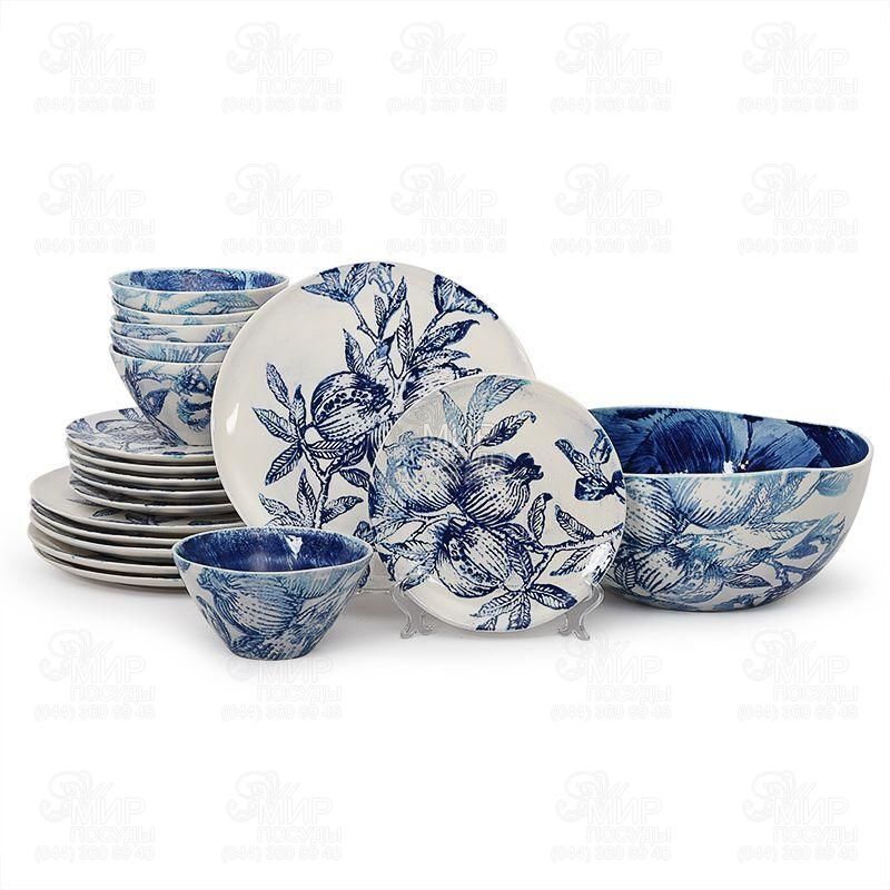 Столовый сервиз, рассчитанный на шесть персон, состоит из пиал и двух видов тарелок. Все предметы объединяет утонченный рисунок в виде фрагментов ветвей со спелыми гранатами красивого синего оттенка, который украшает также дно глубокой посуды. Фруктовый узор нанесен вручную методом штамповки, что делает его уникальным и неповторимым. Каждое изделие доставляет не только эстетическое удовольствие, но и тактильное – если провести по блюду рукой, то можно ощутить фактуру рисунка. Сервиз можно дополнить столовыми приборами с изящными синими ручками из коллекций «Франция» или Queen.