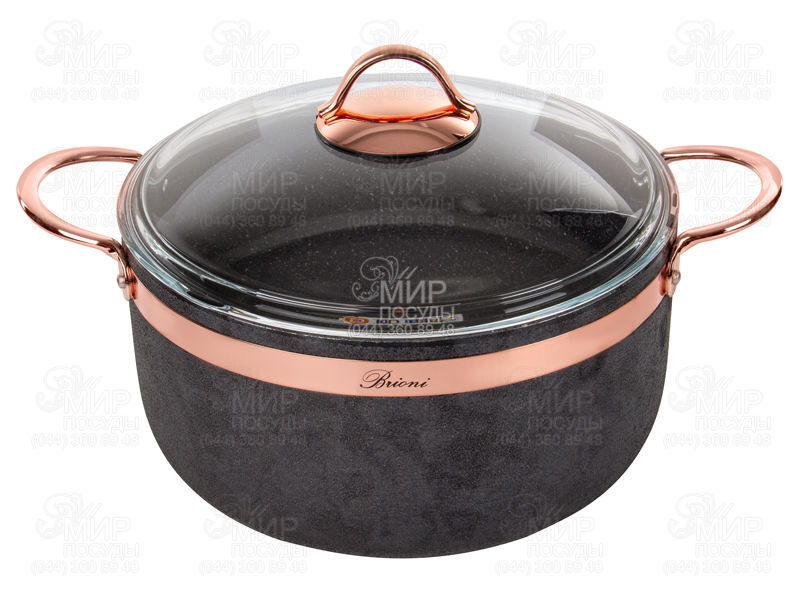 Кастрюля от турецкого производителя Brioni изготовлена из алюминия и покрыта антипригарной гранитной крошкой по немецкой технологии Greblon, уровень защиты С3. Детали и ручки - позолоченый титановый сплав, не нагревающийся при использовании. Крышка - закаленное боросиликатное стекло бренда PYREX. Легко моется губкой в теплой воде. Не предназначено для мытья в посудомоечной машине. Подходит для использования на всех конфорках, кроме индукционных.