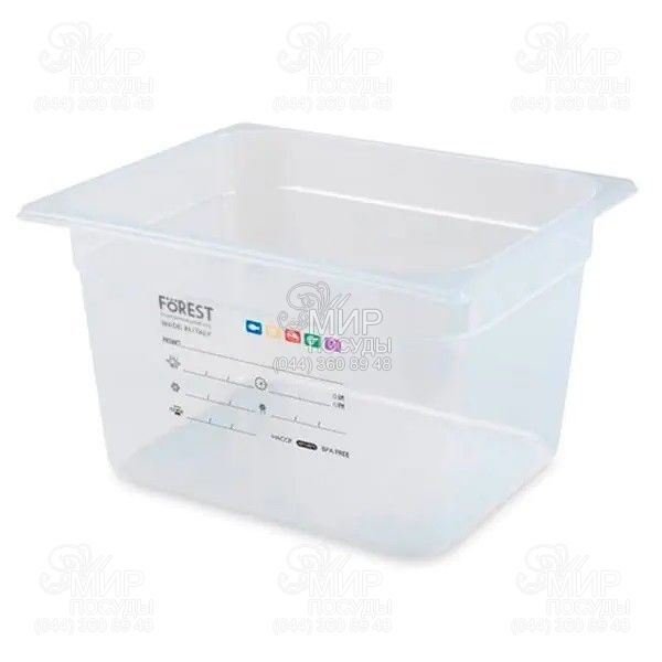 Гастроемкость от европейского производителя FoREST изготовлена из полипропилена. Данный материал безвреден и пригоден к контакту с продуктами питания, это материал уникален тем что он не впитывает влагу и запахи. Изделие предназначено для ежедневного пользования как в барах, ресторанах так и в домашних условиях. Важной отличительной особенносью гастроемкости является возможность укладывать в стопки и наличие специальной этикетки, которая позволяет легко наносить и стирать записи маркером, что особенно важно для более удобного контроля за хранением продуктов.