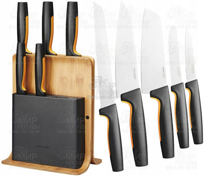 Набор ножей Functional Form от финского производителя Fiscars состоит из 6-ти предметов. В состав набора входят пять ножей, изготовленных из высококачественной нержавеющей стали с твердостью по Роквеллу 53 HRC, а также деревянная колода-подставка. Ножи идеально подойдут для различных кухонных работ — нарезания хлеба, чистки овощей и фруктов, разделки мяса, рыбы и шинкования овощей. Прочные пластиковые рукояти с нескользящим мягким покрытием Softgrip и упором для пальцев, обеспечат безопасное использование и удобство при нарезке. Подставка для ножей выполнена из пластика и дерева, покрыта нетоксичным полимером, защищающим дерево от влаги.