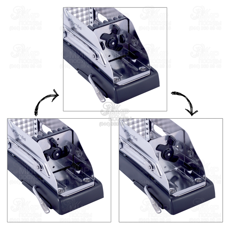 Характеристика: 19,5 х 8,2 х 13,7 см (у основания), с поднятой ручкой 29,5 см, 2 сменных стальных лезвия с 25 отверстиями толщиной 12 мм, с 49 отверстиями толщиной 8 мм