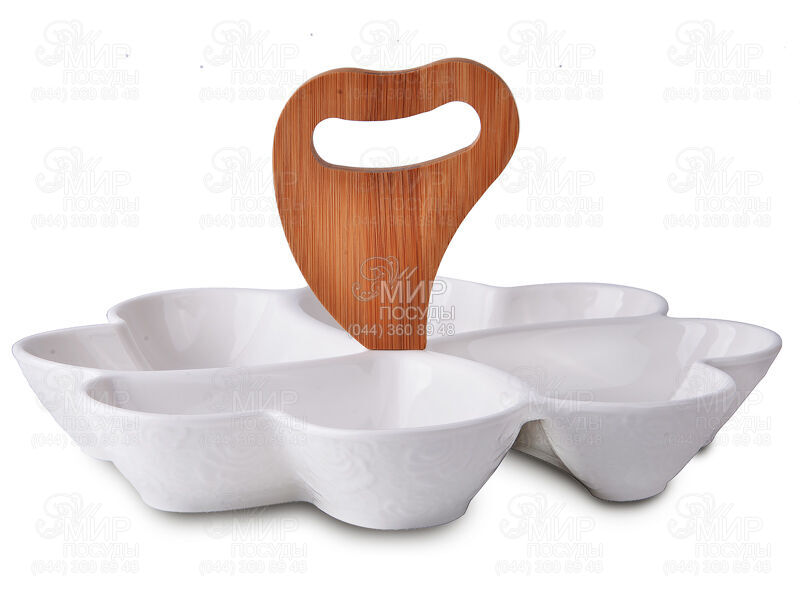 Менажница на бамбуковой подставке от Lefard China изготовлена из фарфора. Емкость обладает довольно удобной формой. Данное изделие может стать прекрасным подарком для родных и близких, а также украсит ваш праздничный стол.
