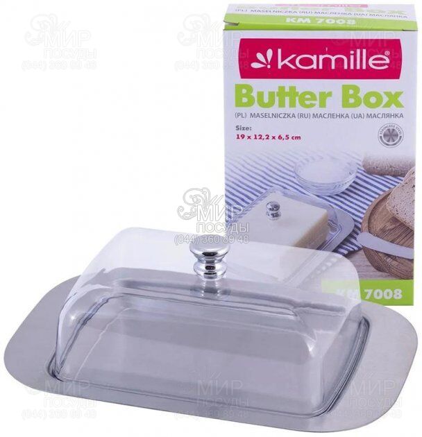 Масленица с крышкой Kamille совершенно незаменимый аксессуар на кухне для хранения сливочного масла в холодильнике. Этот продукт обладает свойством быстро впитывать различные запахи, поэтому его просто необходимо хранить в особых условиях, и в этом случае пригодится красивая и практичная масленка. Ее зеркальная полировка и прозрачная крышка с ручкой в виде шара поможет Вам сохранить свежесть масла и обязательно подойдет к интерьеру Вашей кухни.