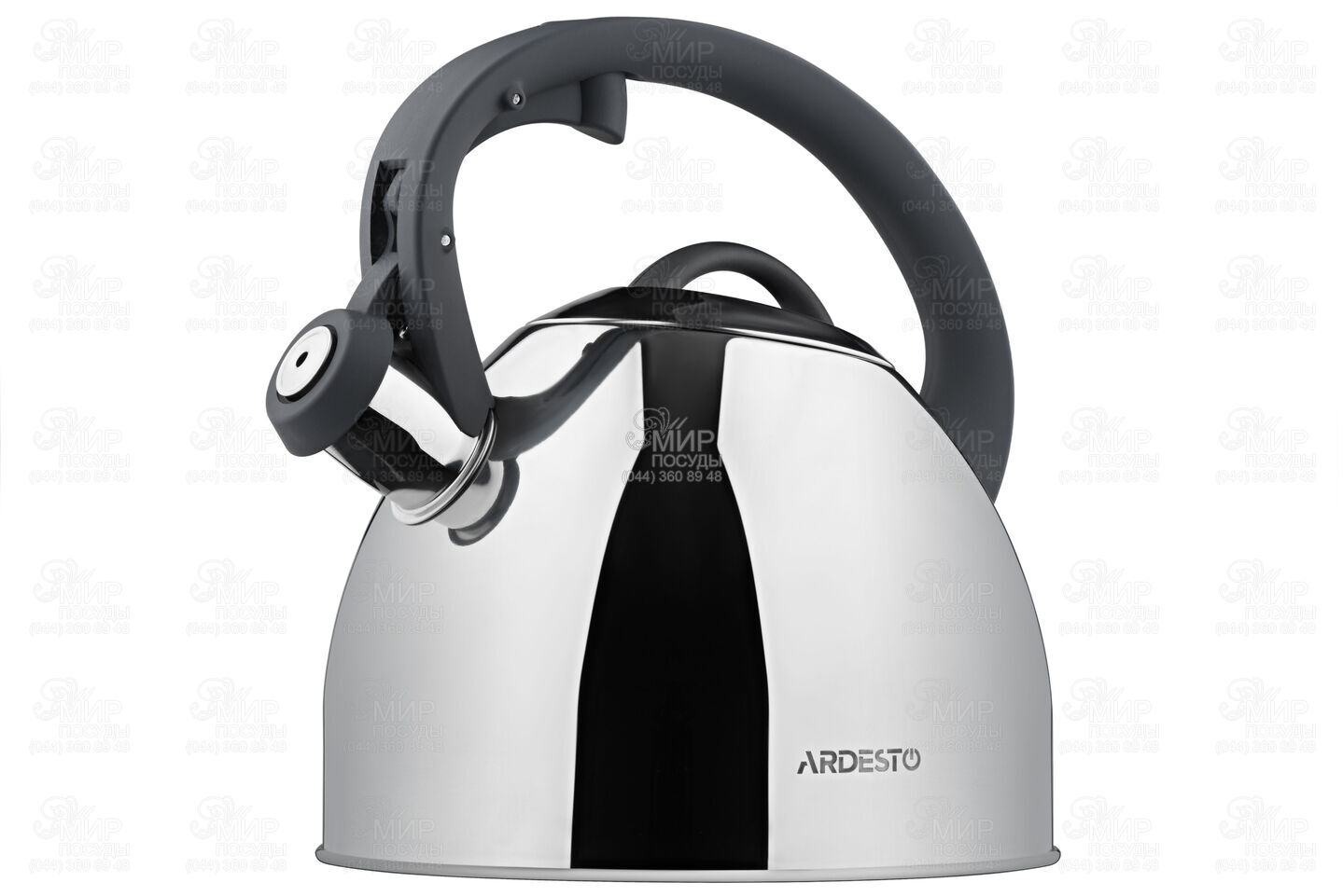 Чайник серии Gemini от украинского бренда Ardesto изготовлен из нержавеющей стали. Наружная часть чайника обладает хромированным покрытием. Для безопасного и удобного использования чайник оснащен термостойкой бакелитовой ручкой серого цвета с софт-тач покрытием и кнопкой открытия носика. Корпус свистка также выполнен из бакелита, который защитит от случайных ожогов при использовании.
