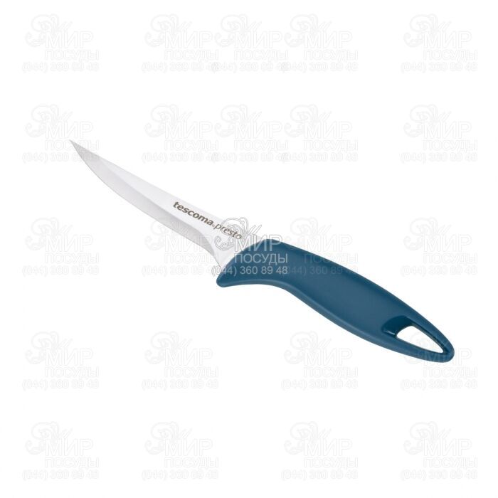 Ніж універсальний Presto від чеського виробника Tescoma виготовлений із нержавіючої сталі. Має ергономічну пластикову ручку з нековзним покриттям, яка кріпиться всадним методом. Цей виріб підходить для щоденного користування, він сформований та заточений для максимальної ефективності та безпеки. Для вертикального зберігання є отвір для гачка.
