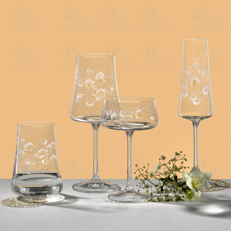 Дизайн колекції Vesna нагадує завитки молодих весняних квітів, що тягнуться до сонця, та ідеально підходить для різних урочистих випадків. Ємності декоровані в техніці пантографа, а золотисто-жовта палітра надає їм відтінок вічної розкоші.