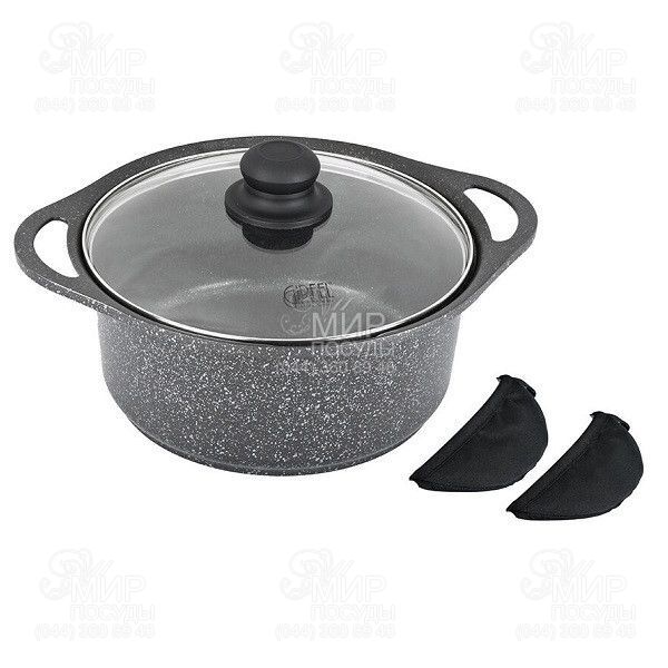Каструля з кришкою Zenit від Gipfel виготовлена з високоякісного литого алюмінію з мармуровим антипригарним 3-х шаровим покриттям ILAG DURIT. Алюміній чудово проводить і рівномірно розподіляє тепло по дну та стінкам посуду. Оснащена зручними литими ручками, а в комплекті є спеціальні бавовняні прихватки. У комплект також входить скляна кришка зі сталевим обідком та бакелітовою ручкою. Такий посуд підійде для використання на побутових чи професійних кухнях.