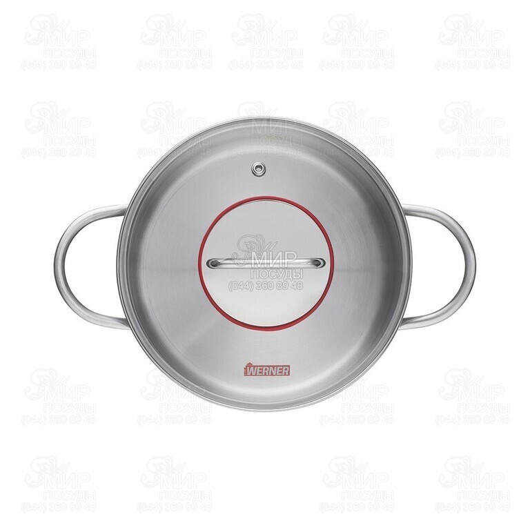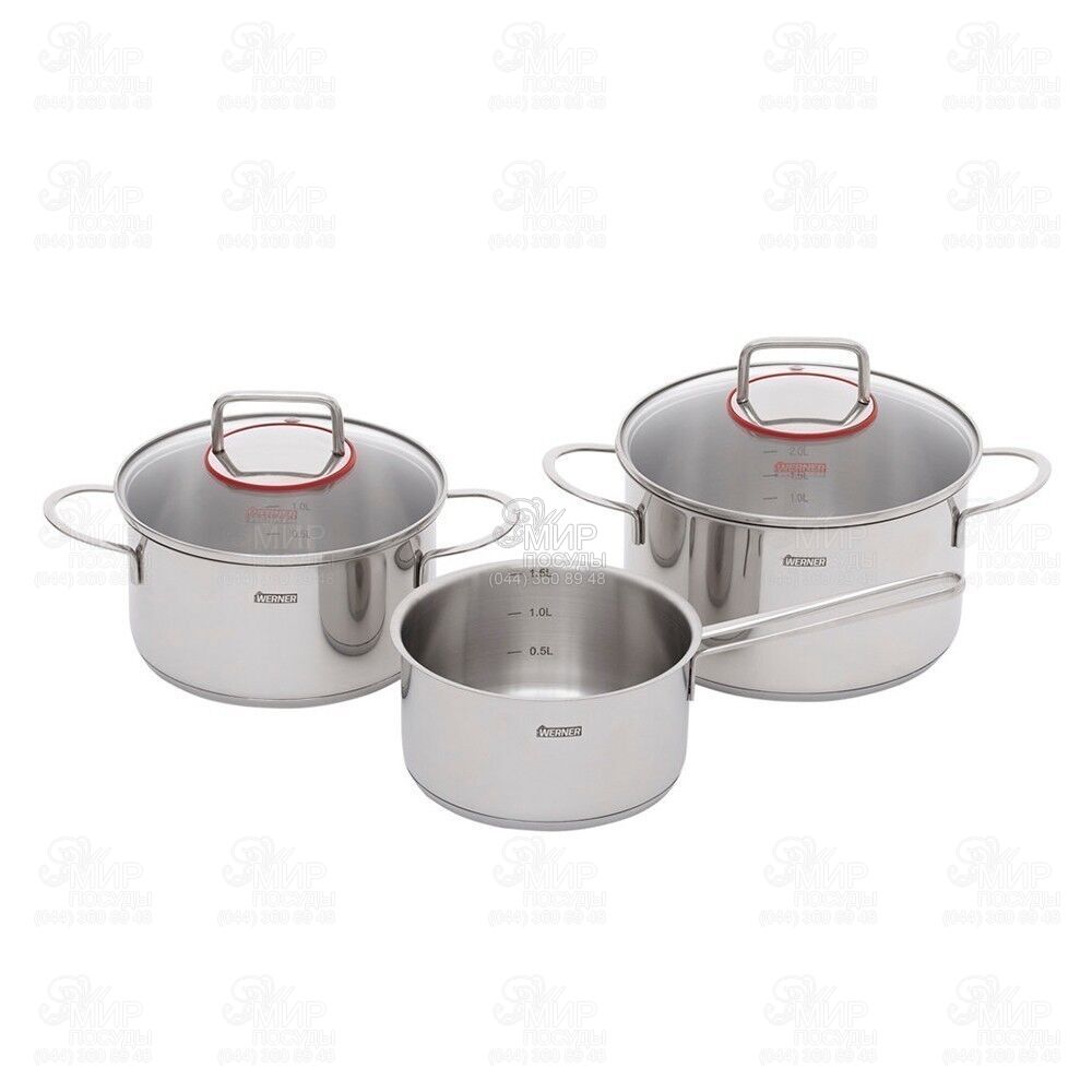 Набір посуду Werner Como Gipfel виготовлений з високоякісної нержавіючої сталі. Весь посуд має багатошарове капсульне дно, що сприяє рівномірному розподілу тепла та збереженню температури страви вже після процесу готування, що дозволяє йому наполягати та придбати більш насичений смак. Ручки міцно приварені. Усередині каструль для зручності є мірна шкала. Закруглені ручки каструль широко розставлені, тому не нагріваються під час готування. Крім того, можна захопити їх всією долонею, не боячись обпектися об гарячі стінки каструлі. Під ручкою скляної кришки є диск з нержавіючої сталі, що нагрівається набагато менше скла і запобігає зіткненню руки з поверхнею кришки. Диск має червону силіконову герметичну окантовку у колір фірмового логотипу Werner. На кришках є отвори для виходу пари.