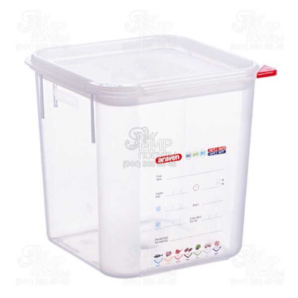 Контейнер повітря від іспанського виробника Araven виготовлений з харчового поліпропілену. Новий дизайн подвійної повітронепроникної кромки на кришці покращує повітронепроникність контейнера, що дозволяє краще зберігати їжу. Збільшує корисне життя продуктів харчування. Кришка має канал, який дозволяє витісняти частину повітря всередині контейнера, зменшуючи окиснення їжі та продовжуючи термін її служби до 25%. Кришка має спеціальну вкладку, щоб легко відкрити контейнер, а також включає нові кольорові скріпки, що допомагають поліпшення для маркування.