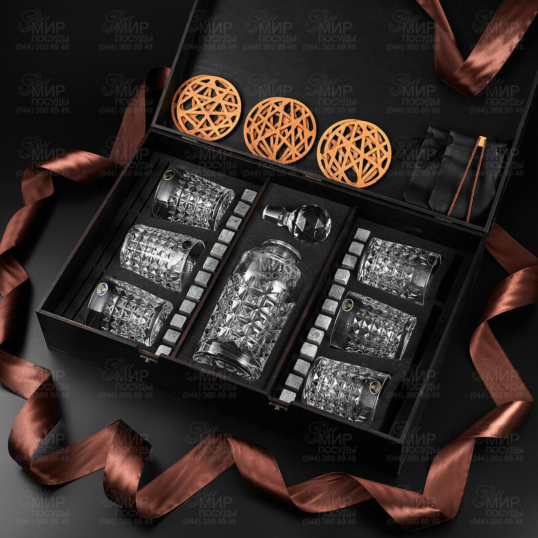 Якісне дерев'яне подарункове упакування в темному дереві. Внутрішня частина - це м'який оксамитовий ложемент, на якому розміщено 24 камені, 6 склянок для віскі, графин, 2 мішеча для каменів з екошкіри, щипці та 6 підставок.
