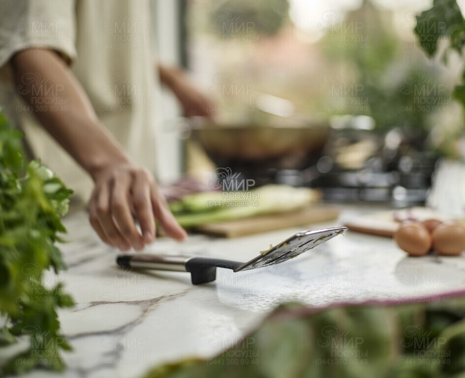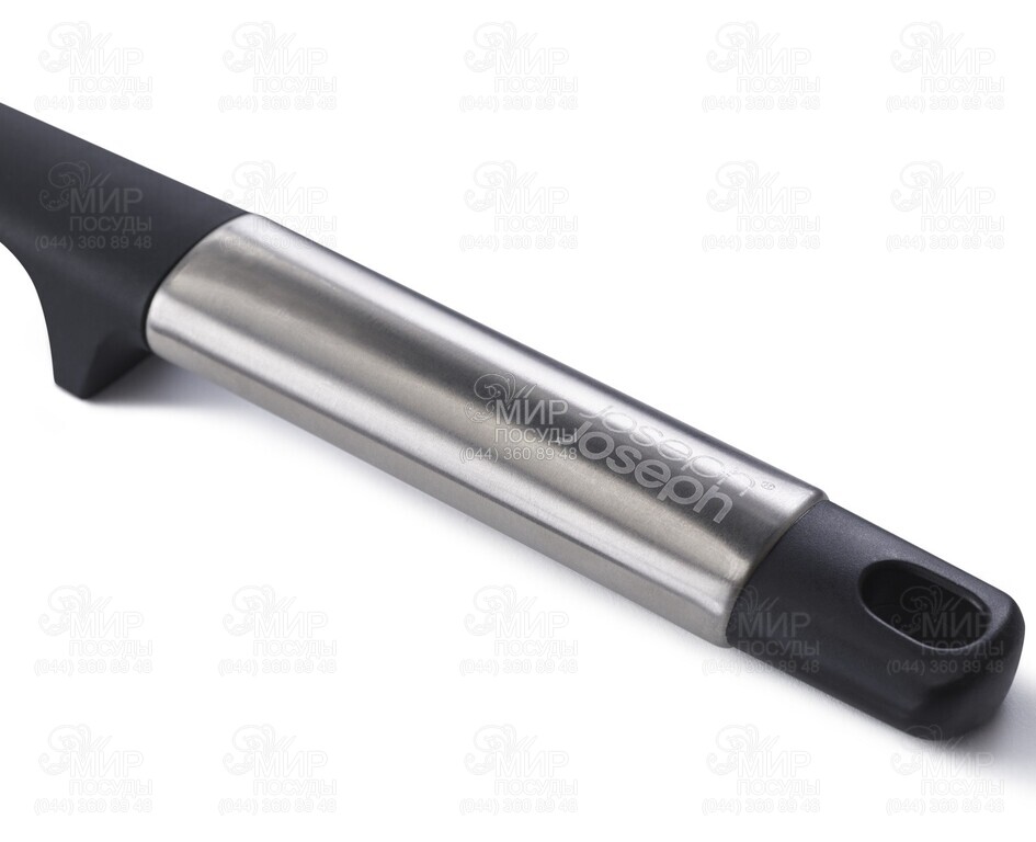 Лопатка Elevate від англійського виробника Joseph Joseph виготовлена з нержавіючої сталі, силікону та нейлону. Призначена для приготування та сервірування. Входить до серії кухонних приладів, розробленої для підтримки максимального порядку під час приготування їжі. Спеціальний обтяжувач у рукоятці постійно утримує наконечник навісу, завдяки чому забруднена частина інструменту ніколи не стосується робочої поверхні. Підходить для спільного використання із протипригарним посудом.