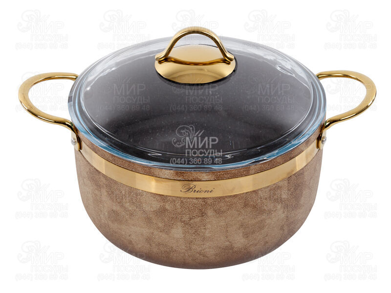 Каструля Royal Stone Ti̇gereye Gold від турецького виробника Brioni виконана за інноваційною та унікальною технологією нанесення зовнішнього покриття, завдяки якій є вогнетривкою, антипригарною та дає відчуття натурального каменю. Незвичайні ручки даної моделі виготовлені за спеціальною технологією і були запатентовані. Внутрішнє 3-х шарове покриття Greblon C3 Granite забезпечує ультра-антипригарне покриття, а також має високу стійкість до подряпин.