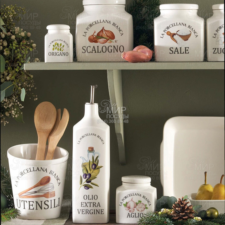 Колекція Conserva від La Porcellana Bianca перенесе вас у світ маленького тосканського містечка з чарівністю маленьких затишних вуличок. Кухонні аксесуари цієї колекції виконані з високоякісної порцеляни, яка захоплює вінтажним стилем. Підберіть необхідні ємності в єдиному дизайні: для солі, цукру, печива, олії, кави, цибулі та часнику. Декоративні зображення та написи допоможуть здогадатися про призначення окремих баночок.