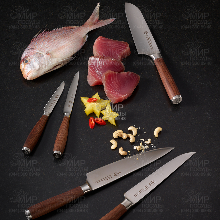 Серію кухонних ножів Masterclass від німецького виробника Rosle відрізняє високоякісна сталь нержавіюча X50CrMOV15 з полірованим лезом і дерев'яною рукояткою в особливому дизайнерському виконанні. Безпечні та легкі в роботі ножі від Rosle довгий час тримають заточення, зручні в роботі та підкорили серця тисяч справжніх професіоналів та любителів кулінарного мистецтва.