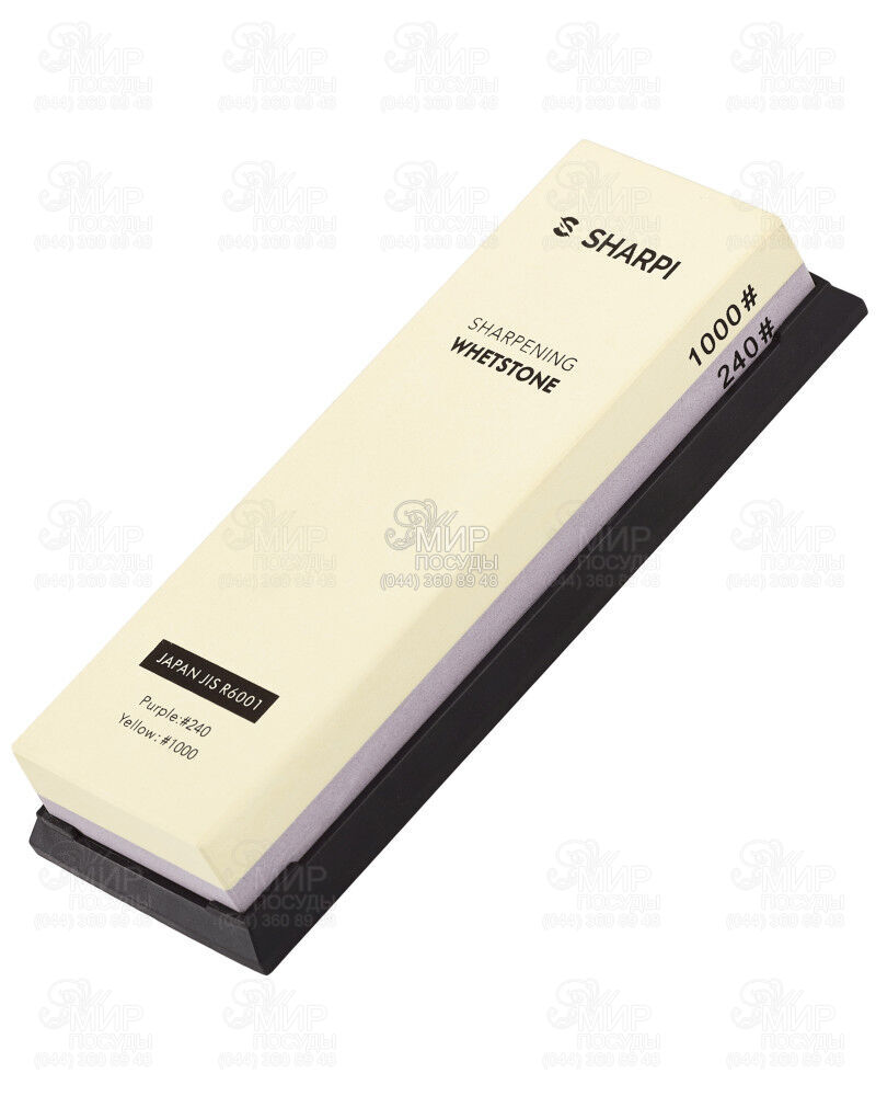 Точильний камінь Sharpi з великою зернистістю (240) для відновлення леза шляхом видалення глибоких подряпин і дрібною зернистістю (1000) для досягнення максимальної гостроти. Підвищена жорсткість каменю відповідно до японського стандарту JIS R6001 забезпечує швидке заточування.
