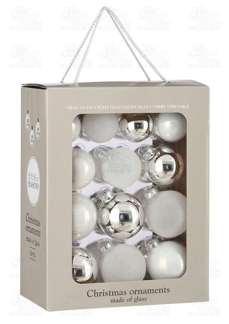 Ялинкові кульки від голландського бренду House of Seasons – невіддільний новорічний елемент декору, без якого важко уявити різдвяну атмосферу. Особливістю набору є різноманітність розмірів та покриттів скляних кульок, представлених у класичному білому відтінку, що дозволяє привабливо прикрасити новорічне дерево у повноцінну композицію.